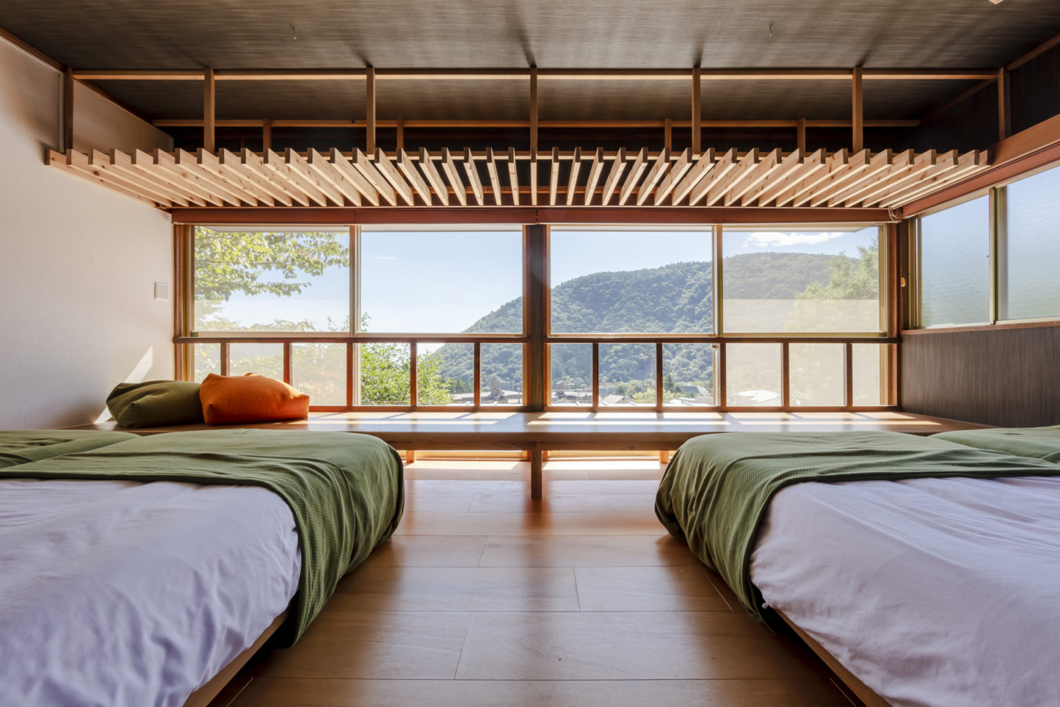 敷地は、箱根町強羅。大文字焼きで知られる明神ヶ岳や浅間山が窓から覗かせるバブル期に造られた温泉付き住宅である。当然考えられる和風に寄せていく表面的なインテリアデザイン手法に頼らず、低予算でインバウンド向けにも配慮される建築的空間をどうつくるか。我々は屋外に着目した。既存の建物には、日本庭園を模したような小規模な人工庭が備えられていたが、目の前には明神ヶ岳や浅間山の広大な借景が眼に映る環境であった為、庭を排除し、ここでしか感じられない山々の四季を望めるテラスをつくる。テラスには低い軒先の屋根がかけられ、風景をさらに演出する風情のある軒下空間が生まれた。