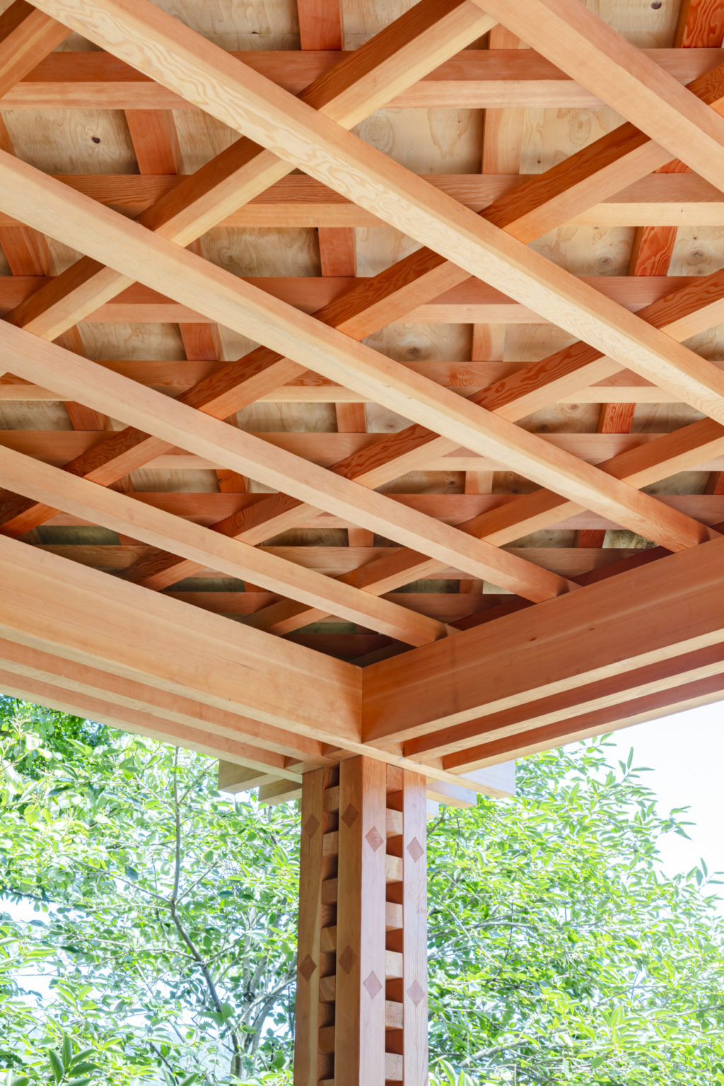 敷地は接道条件が悪い。車両での搬入出が不可能な為、解体から全て手作業で行う必要があった。そこでテラスの屋根に使用する構造材には人力で行える少しでも軽量な小径木材を採用し、スタディを重ねた。箱根には江戸時代後半から作られ始めた寄木細工という伝統的な組み木がある。この手法で屋根を構築できないかと考えた。4本の90角柱とその間に60角の繋ぎ材で作る合成柱、その柱に組み込まれるように3本の60×210梁材を流し、60角の垂木を井桁、斜め格子状に積層させた組み木構造とした。座金を隠蔽する座掘も菱形にするなど、箱根の歴史を継承する伝統工法的な屋根組みができた。