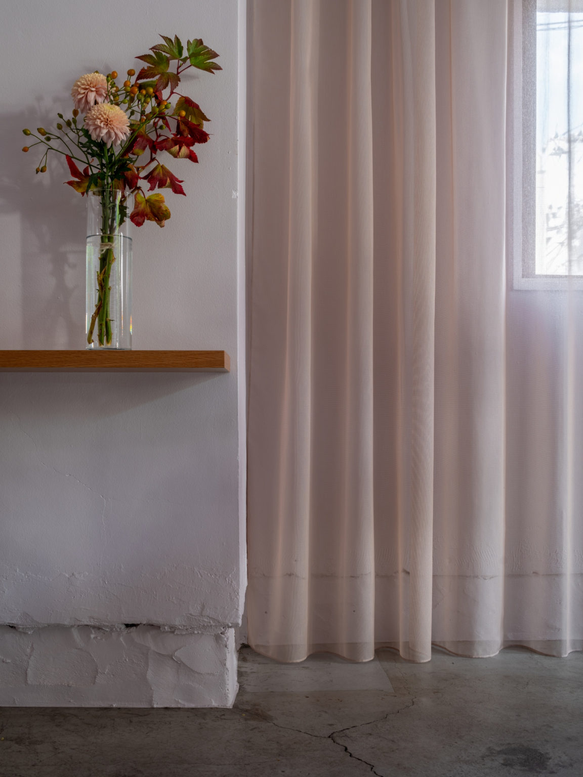 穏やかにドレープがかかった繊細なカーテンの垂直性は空間の高さを強調し、また後ろの壁に残る古いサッシの存在感とテクスチャを覆い隠して、やわらかな光のみがホールに入るようになる。