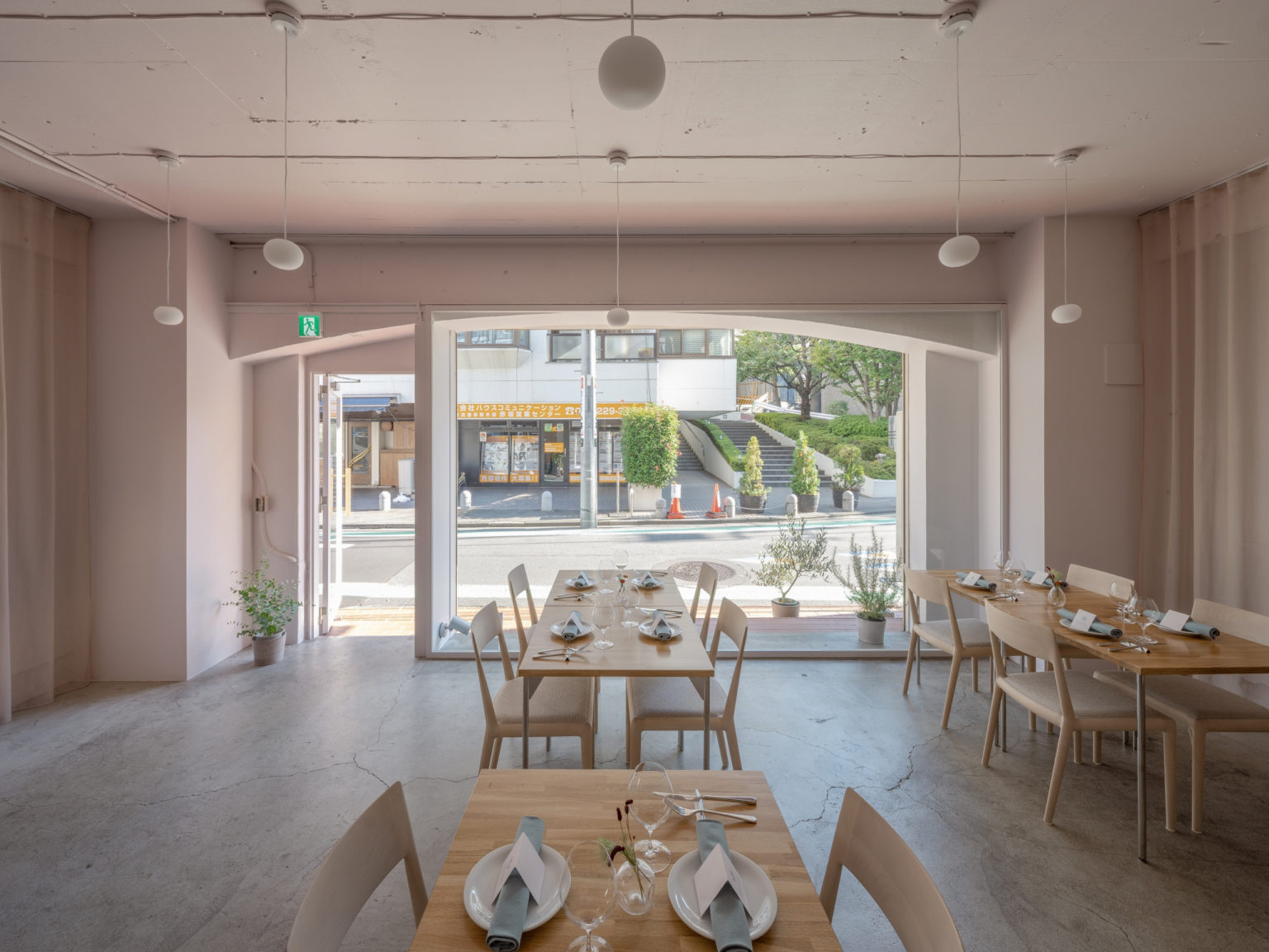 入り口が大きく天井の高い洞窟のようだったRCの躯体に、新しく計画するものを出来るだけ等価に馴染ませてみる。古さや新しさ、荒々しさと上品さといった対になる要素が共存する新しい全体が立ち上がることで、お店が元からそこにあったように周囲の街に溶け込んでいけたらいいなと考えた。