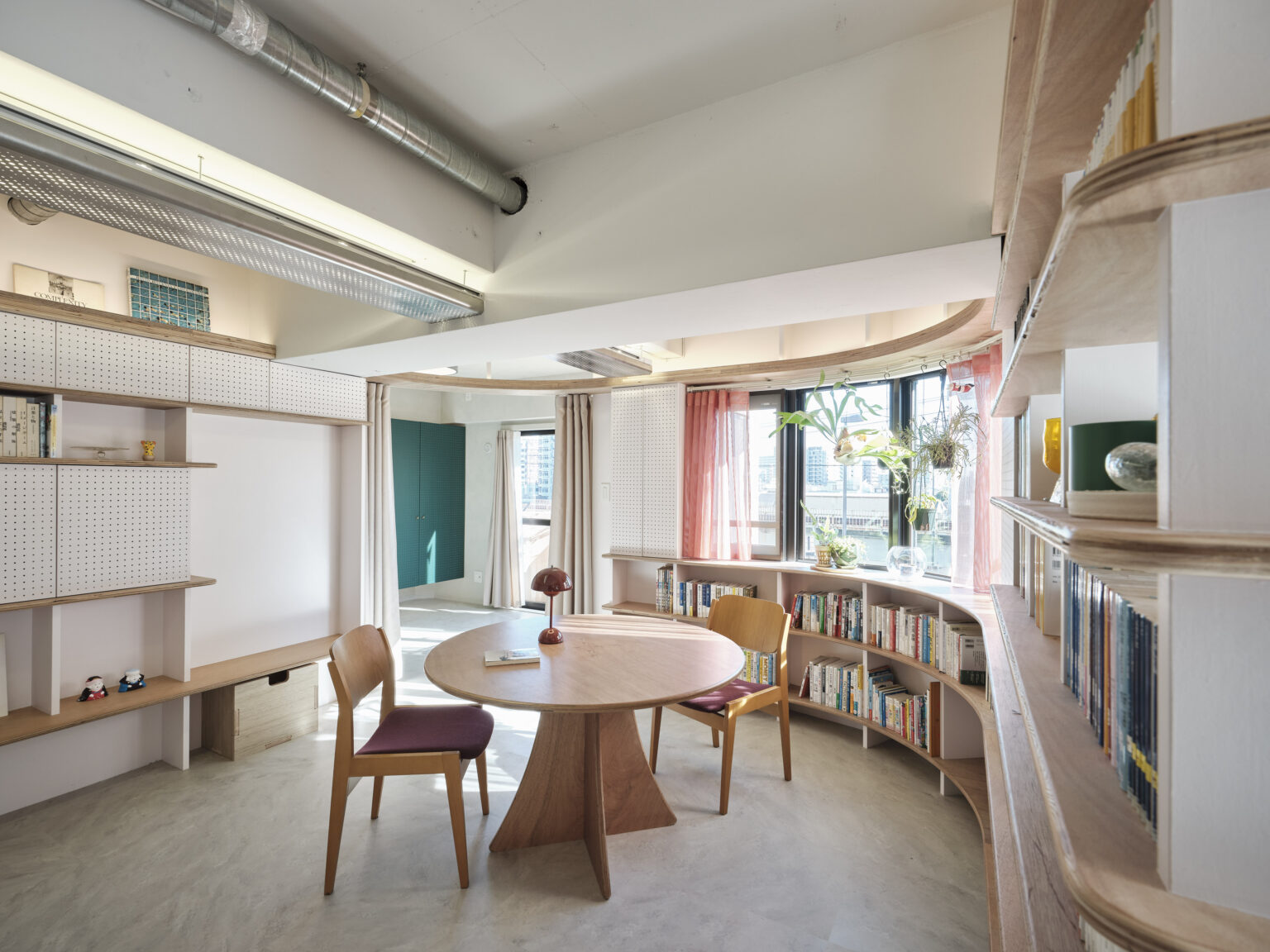 円環の本棚の背景には各部屋がまとわりつき、様々な奥⾏を与える。カーテン、開き⼾、引⼾等の設えの差がリビングに表情を作る。