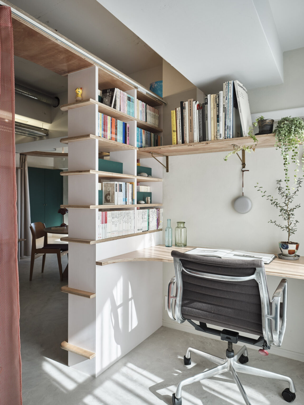 お⼦さんへの配慮として本棚の⼩⼝はR 形状とし、⽔平基調をより強調するためにベニヤ材を使⽤した。棚板は垂直⽀持材より50mm 勝たせている。⽔平ラインを強調し伸びやかさを作りながら、コーヒー等を置けるさりげない場所として暮らしの拠り所とした。リビングと各室を繋ぐ動線部は吊り⼾棚となり、上部にはぐるりと⼀周、照明を配置している。吊り⼾棚にはカーテンレールを組込み、空間を仕切る機能を持たせている。