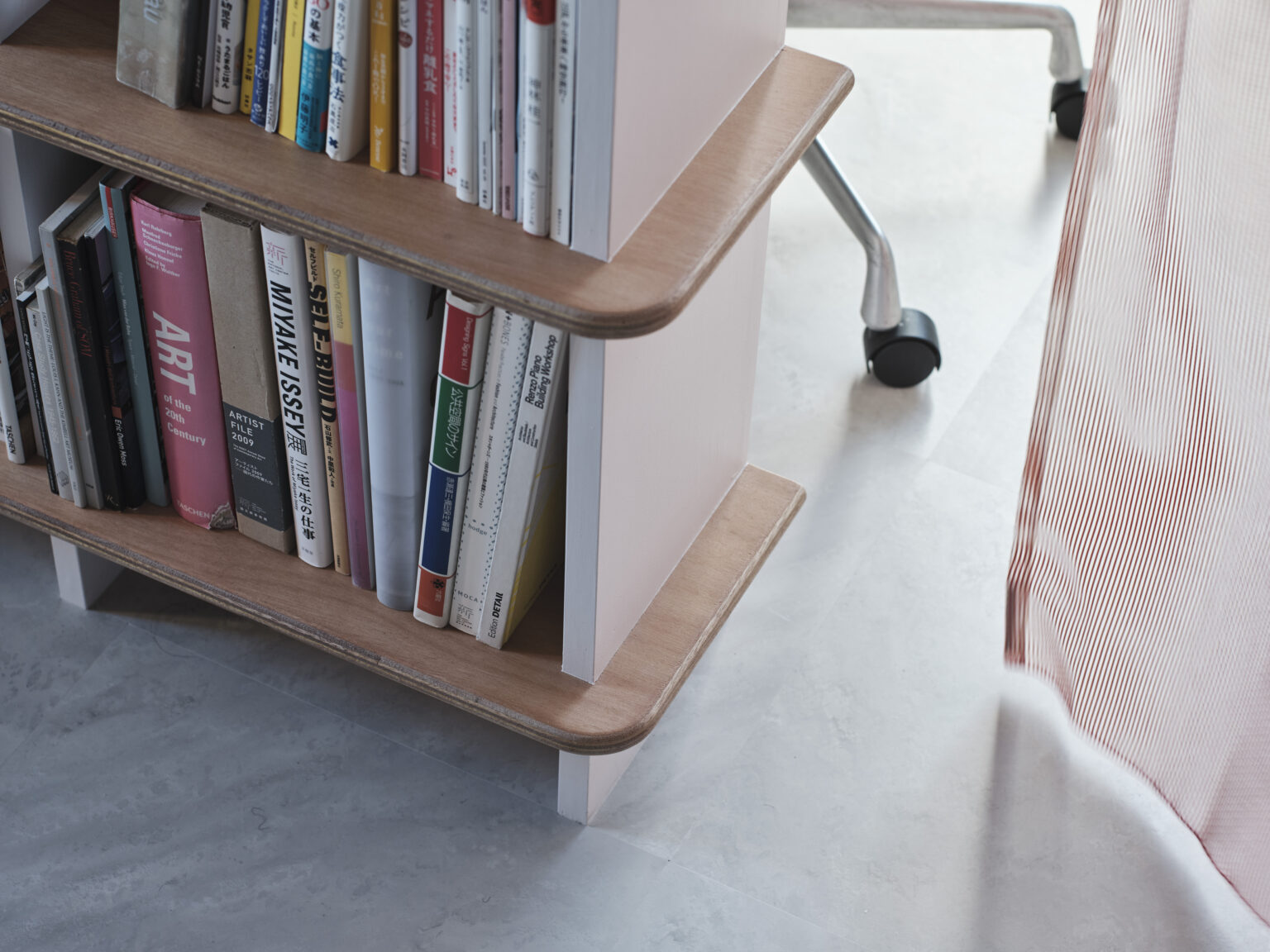 雁⾏しながらつながる空間と円環の本棚が交わる中央にφ1200 の円卓を造作した。本棚の⽔平フィンと同じフィレットした断⾯形状とし、ぐるりとどこにでも椅⼦を配置できるよう中央⼀本⾜のデザインとした。