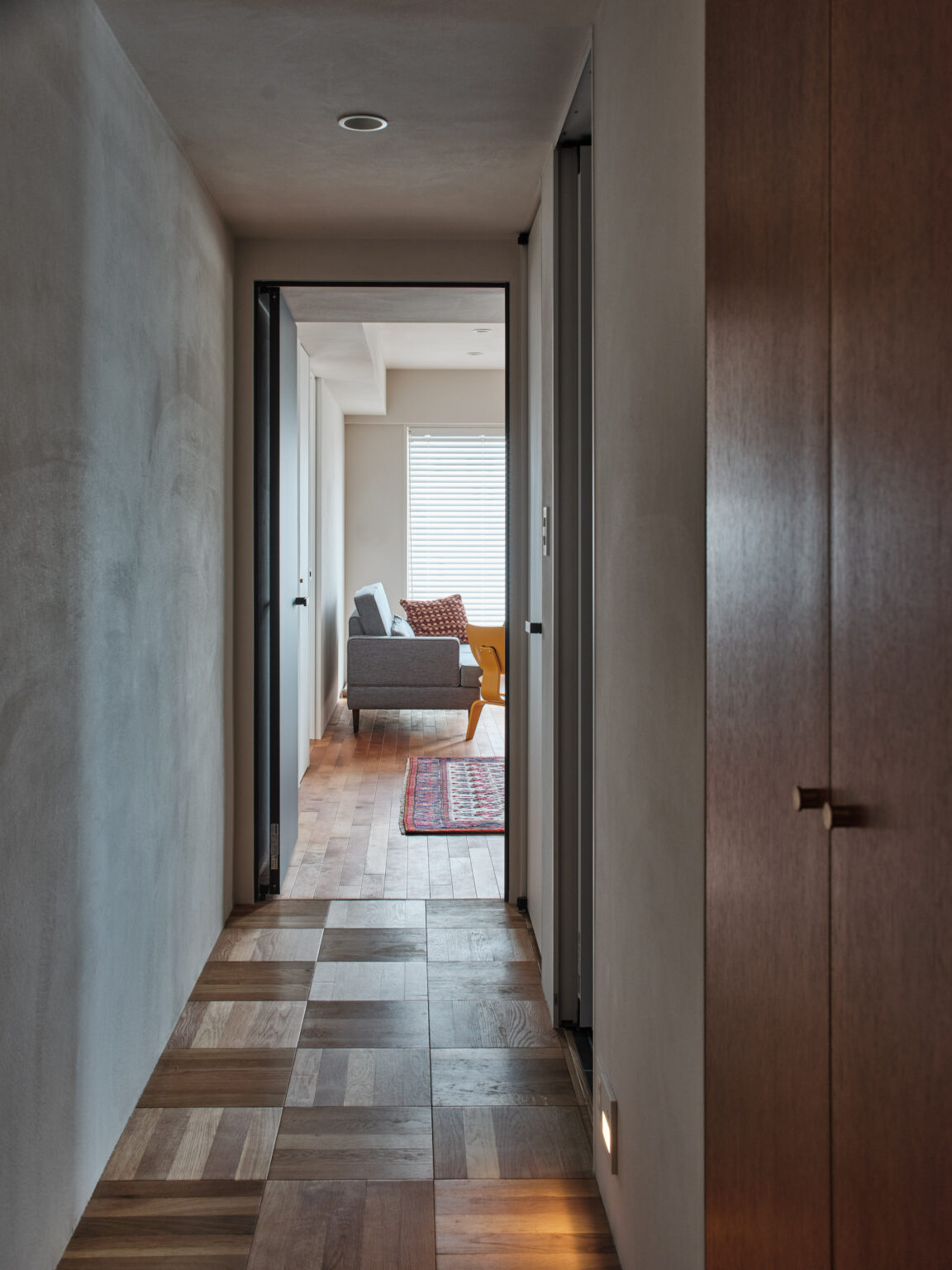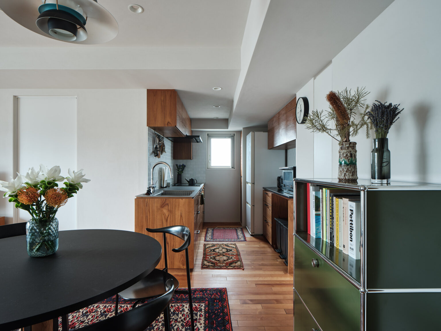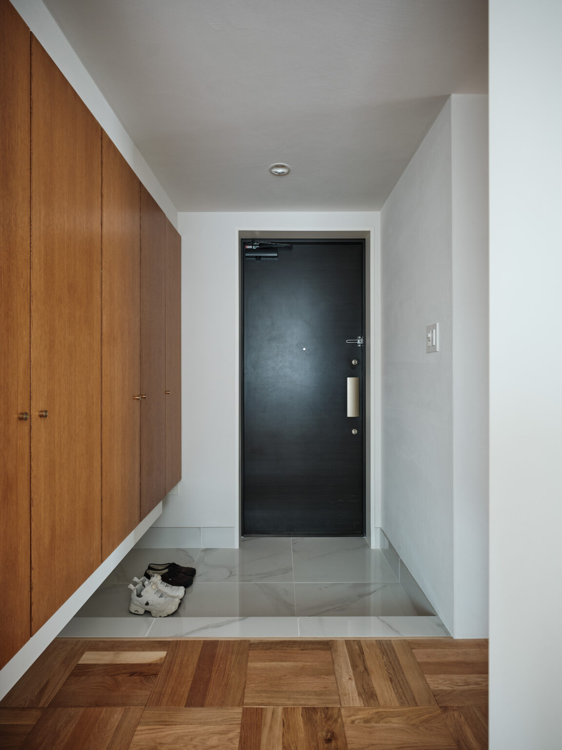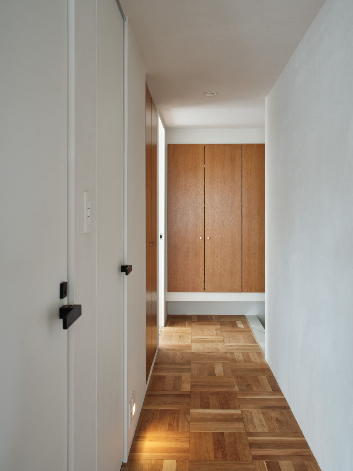 数年前に弊社にてリノベーションを手がけたお施主様より、お引っ越しを機に再度ご依頼をいただいた、3人家族の住まいである。内装仕上げは前住居の仕様を踏襲しつつ、施主の嗜好である素材感や質感を丁寧に取り入れ、全体の統一感を図った。3分艶の塗料を用いることで、オーク材の建具やパーケット柄・ヘリンボーン柄の床に、落ち着きと上質さを与えている。また、採光条件を改善するため、袖壁によって奥まっていたキッチンの壁を撤去し、リビング・ダイニングと一体となった明るい空間構成とした。