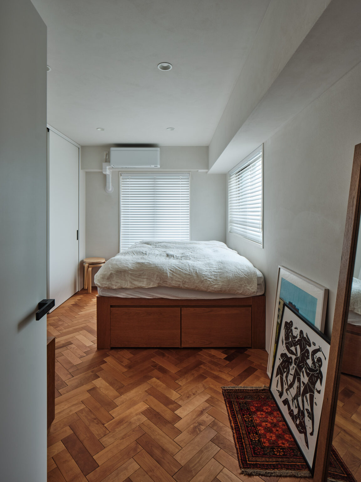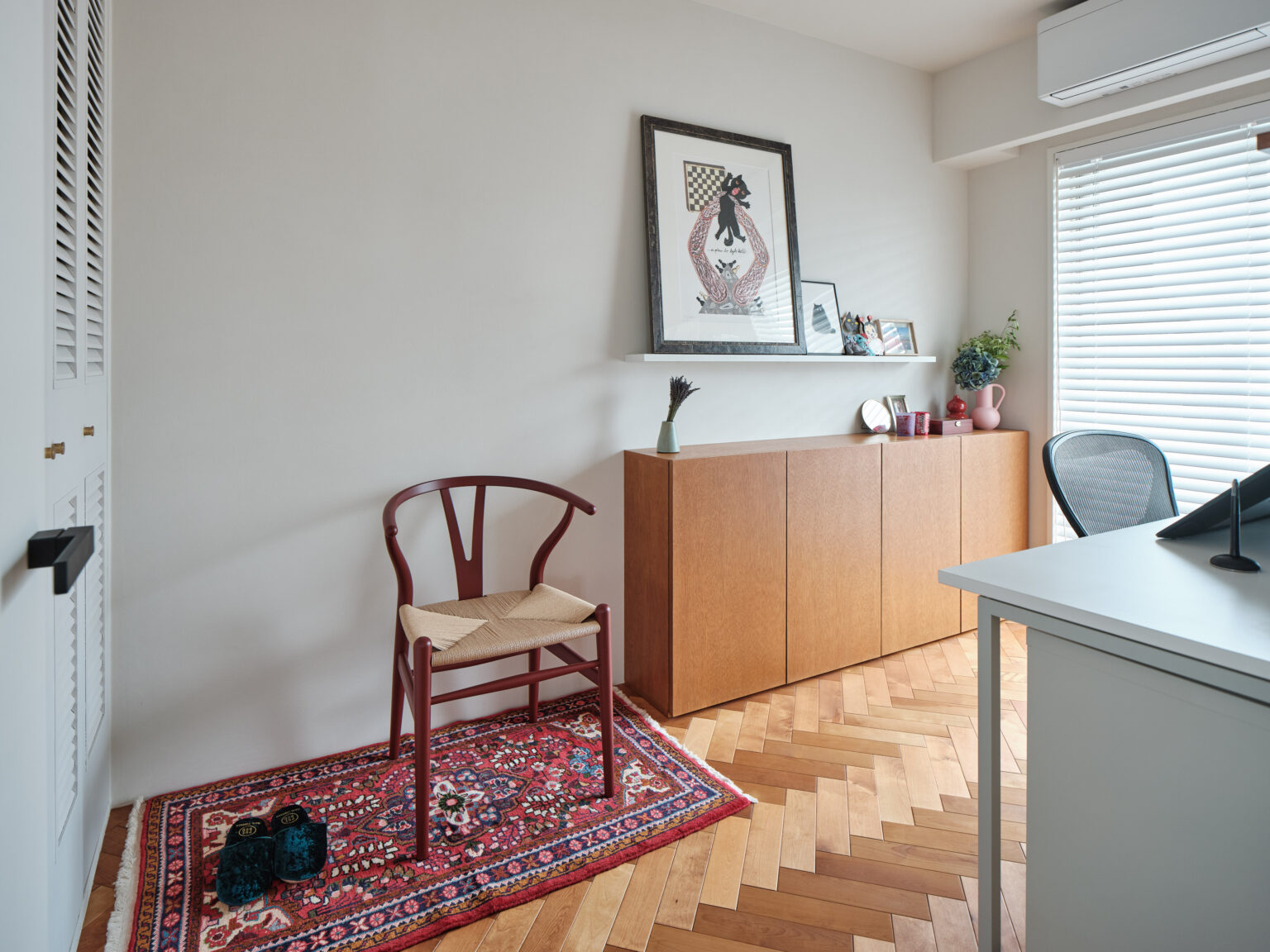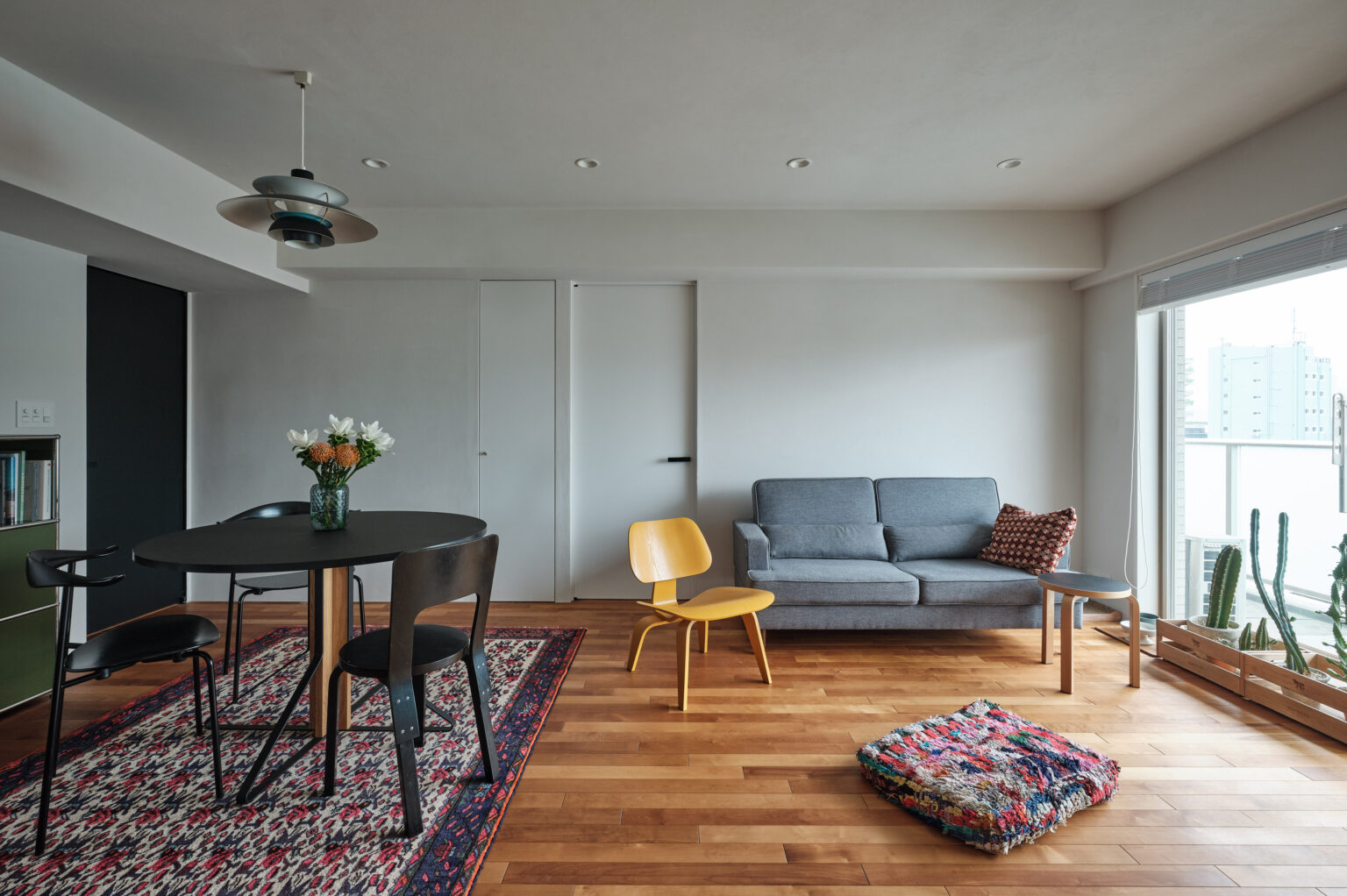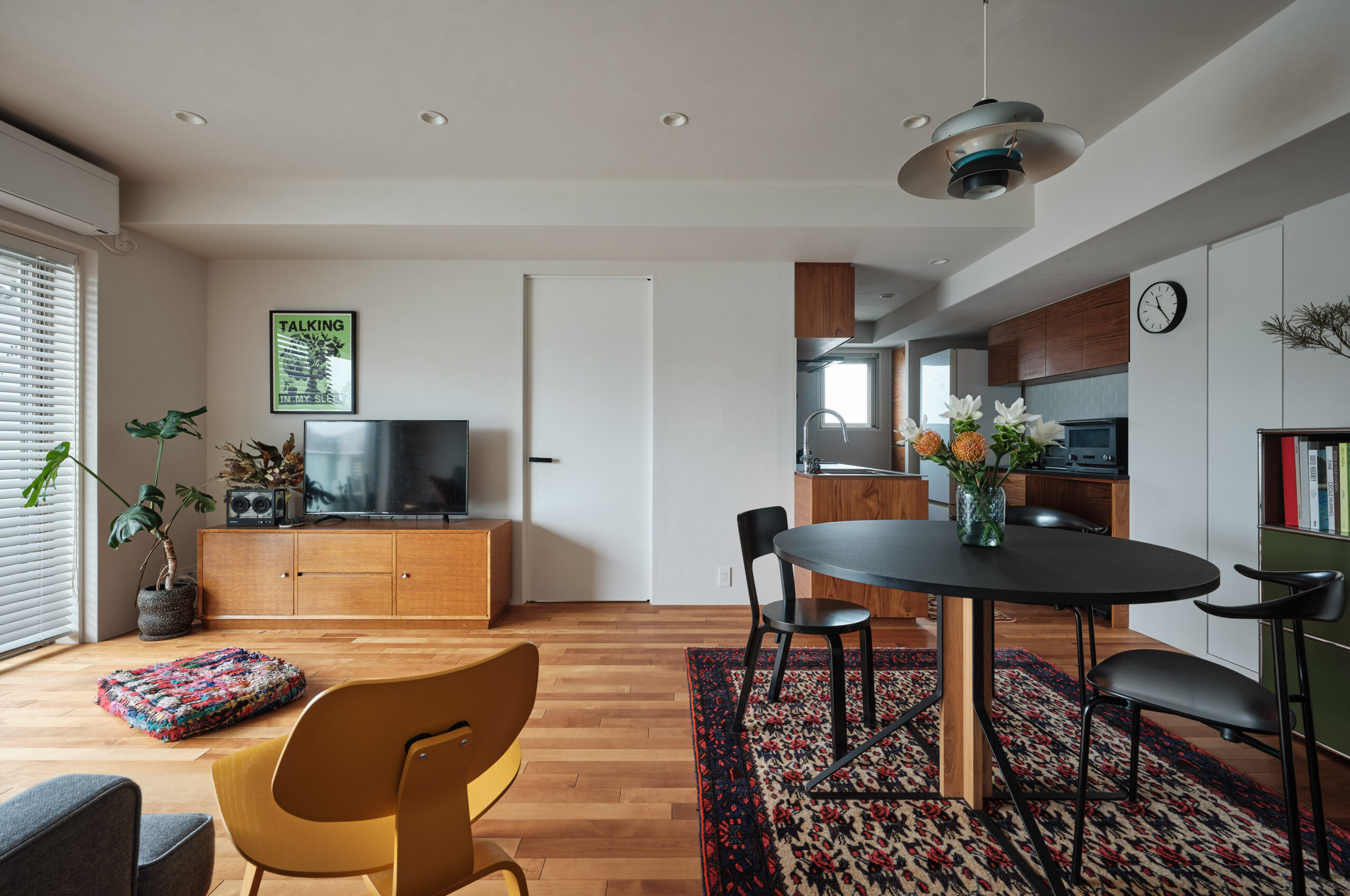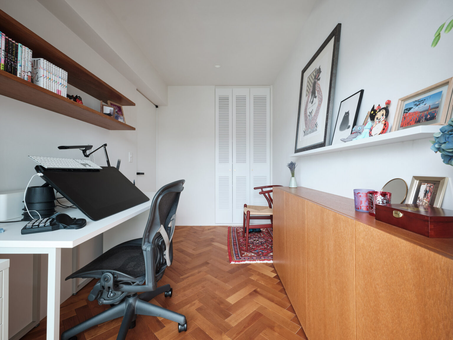 数年前に弊社にてリノベーションを手がけたお施主様より、お引っ越しを機に再度ご依頼をいただいた、3人家族の住まいである。内装仕上げは前住居の仕様を踏襲しつつ、施主の嗜好である素材感や質感を丁寧に取り入れ、全体の統一感を図った。3分艶の塗料を用いることで、オーク材の建具やパーケット柄・ヘリンボーン柄の床に、落ち着きと上質さを与えている。また、採光条件を改善するため、袖壁によって奥まっていたキッチンの壁を撤去し、リビング・ダイニングと一体となった明るい空間構成とした。