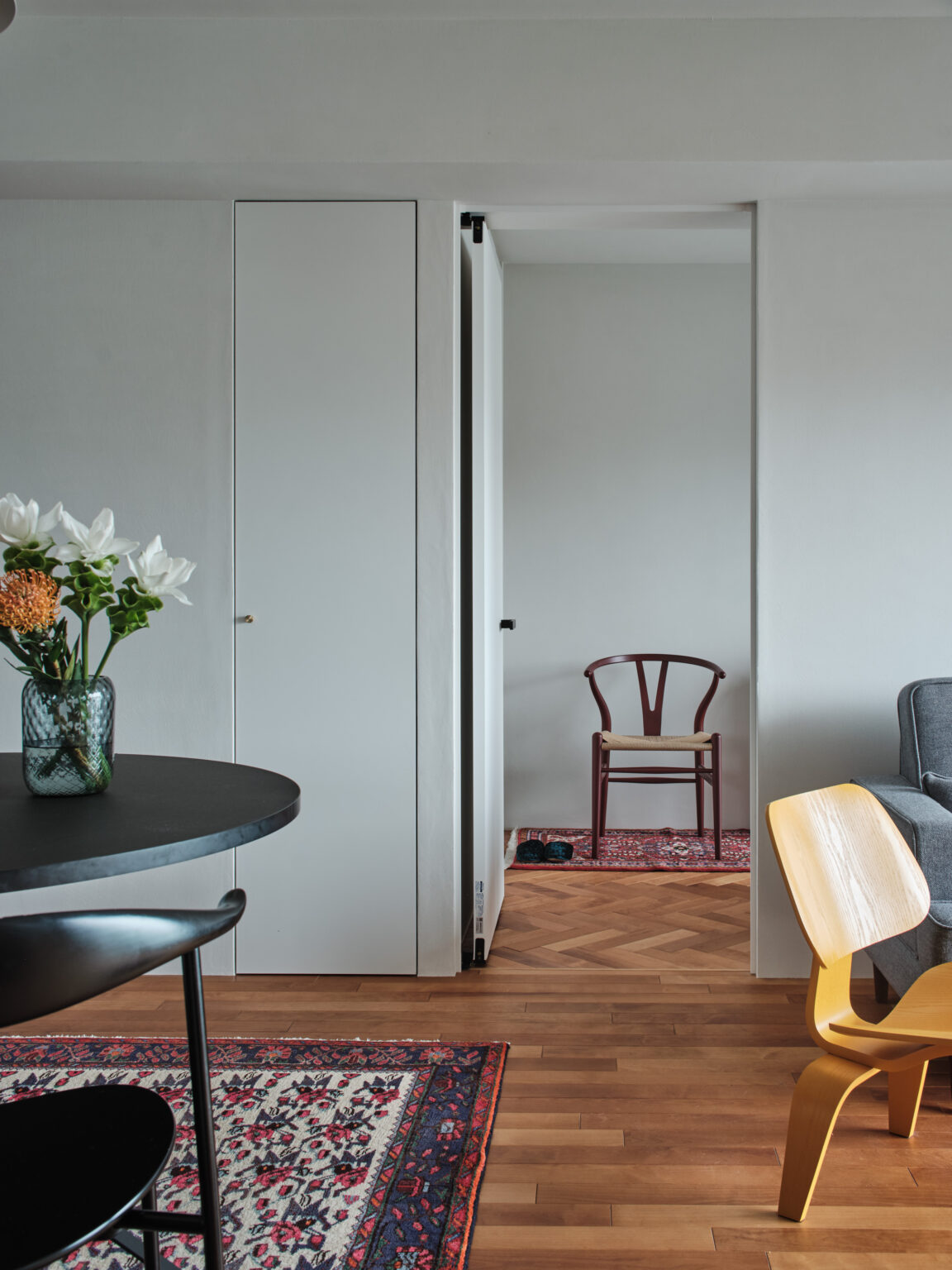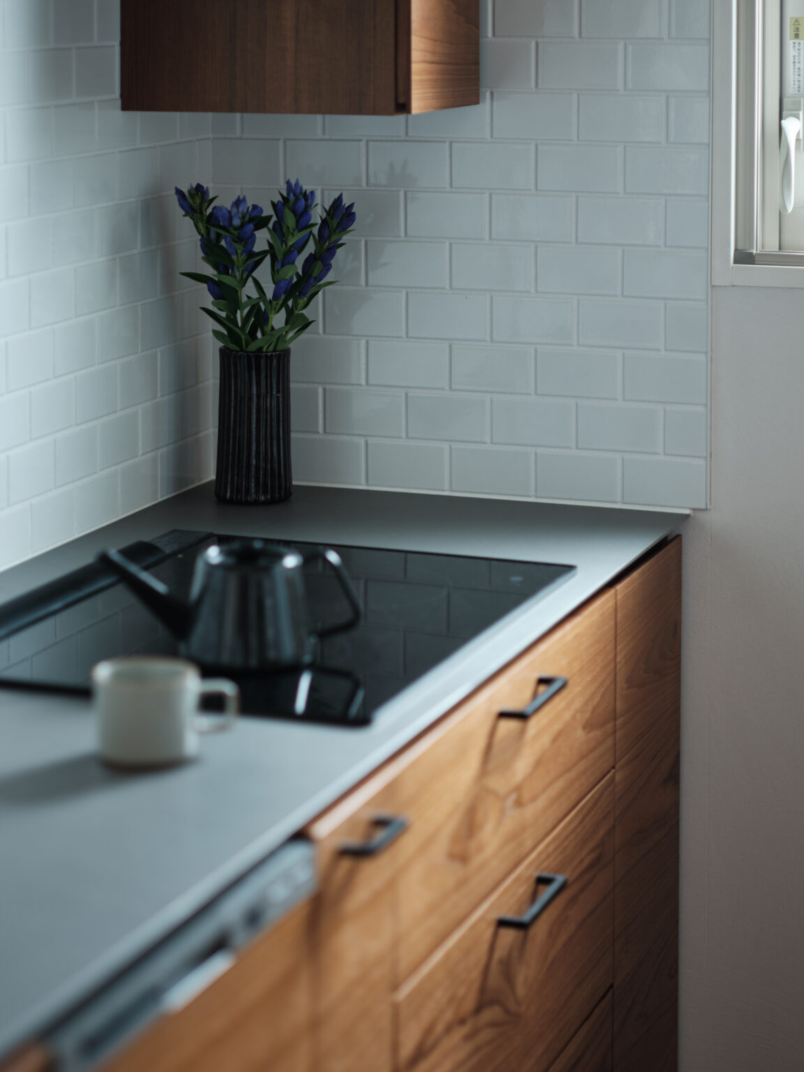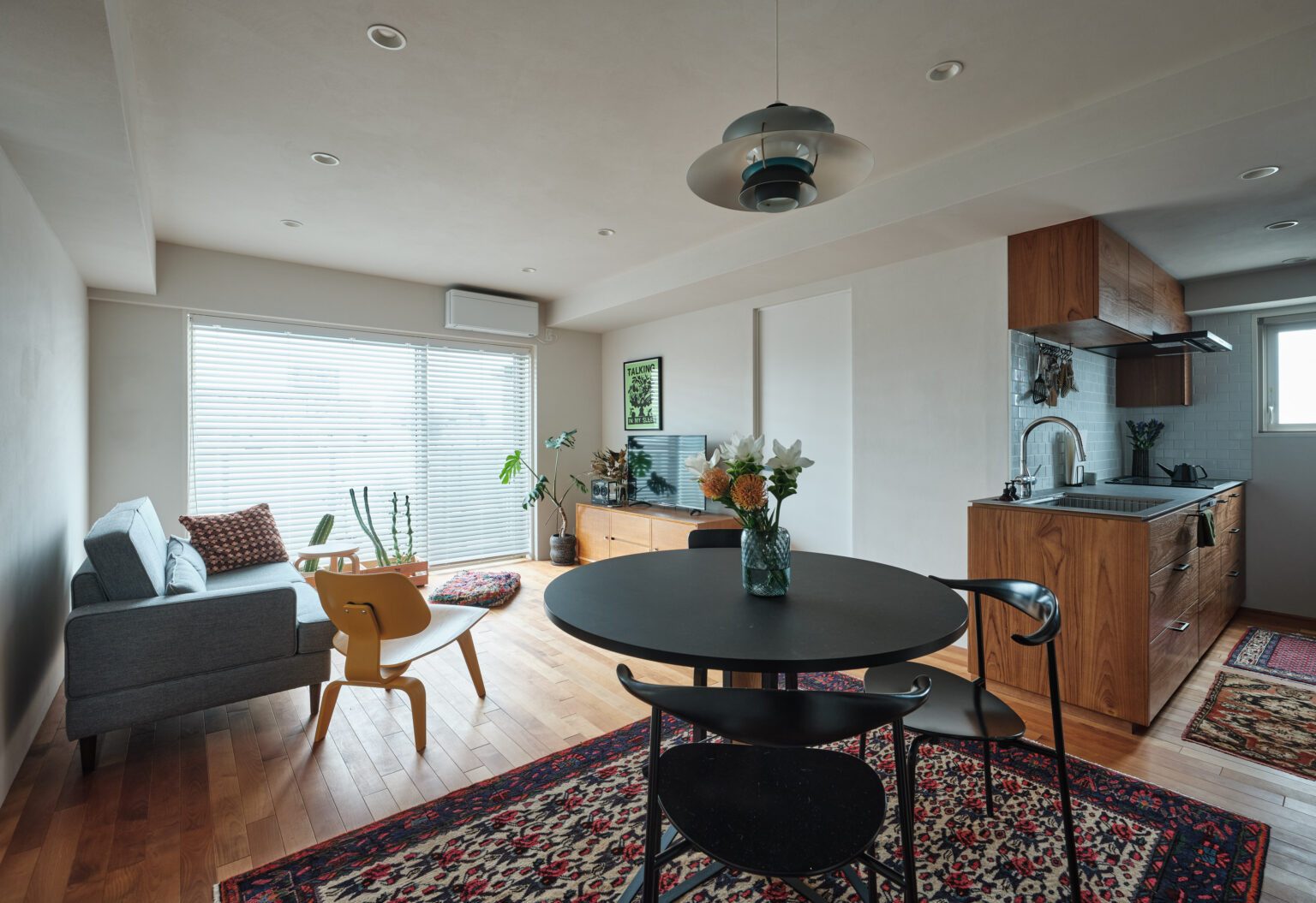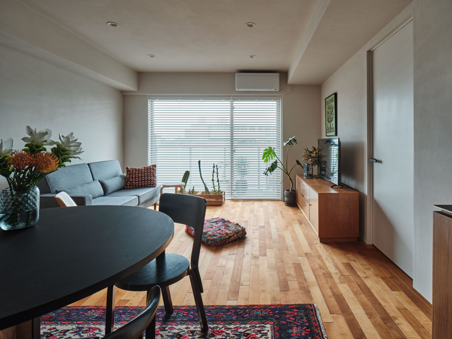 数年前に弊社にてリノベーションを手がけたお施主様より、お引っ越しを機に再度ご依頼をいただいた、3人家族の住まいである。内装仕上げは前住居の仕様を踏襲しつつ、施主の嗜好である素材感や質感を丁寧に取り入れ、全体の統一感を図った。3分艶の塗料を用いることで、オーク材の建具やパーケット柄・ヘリンボーン柄の床に、落ち着きと上質さを与えている。また、採光条件を改善するため、袖壁によって奥まっていたキッチンの壁を撤去し、リビング・ダイニングと一体となった明るい空間構成とした。