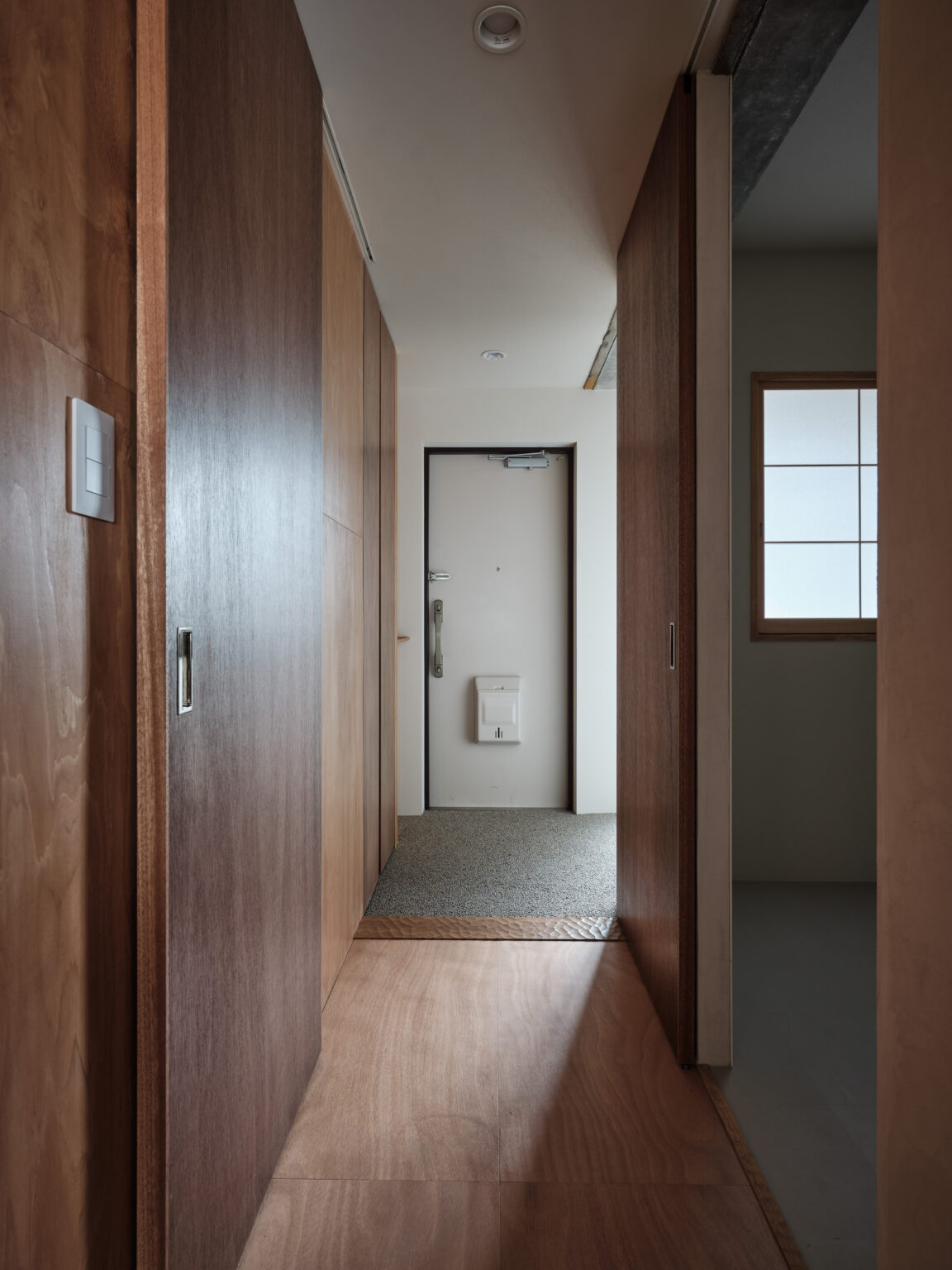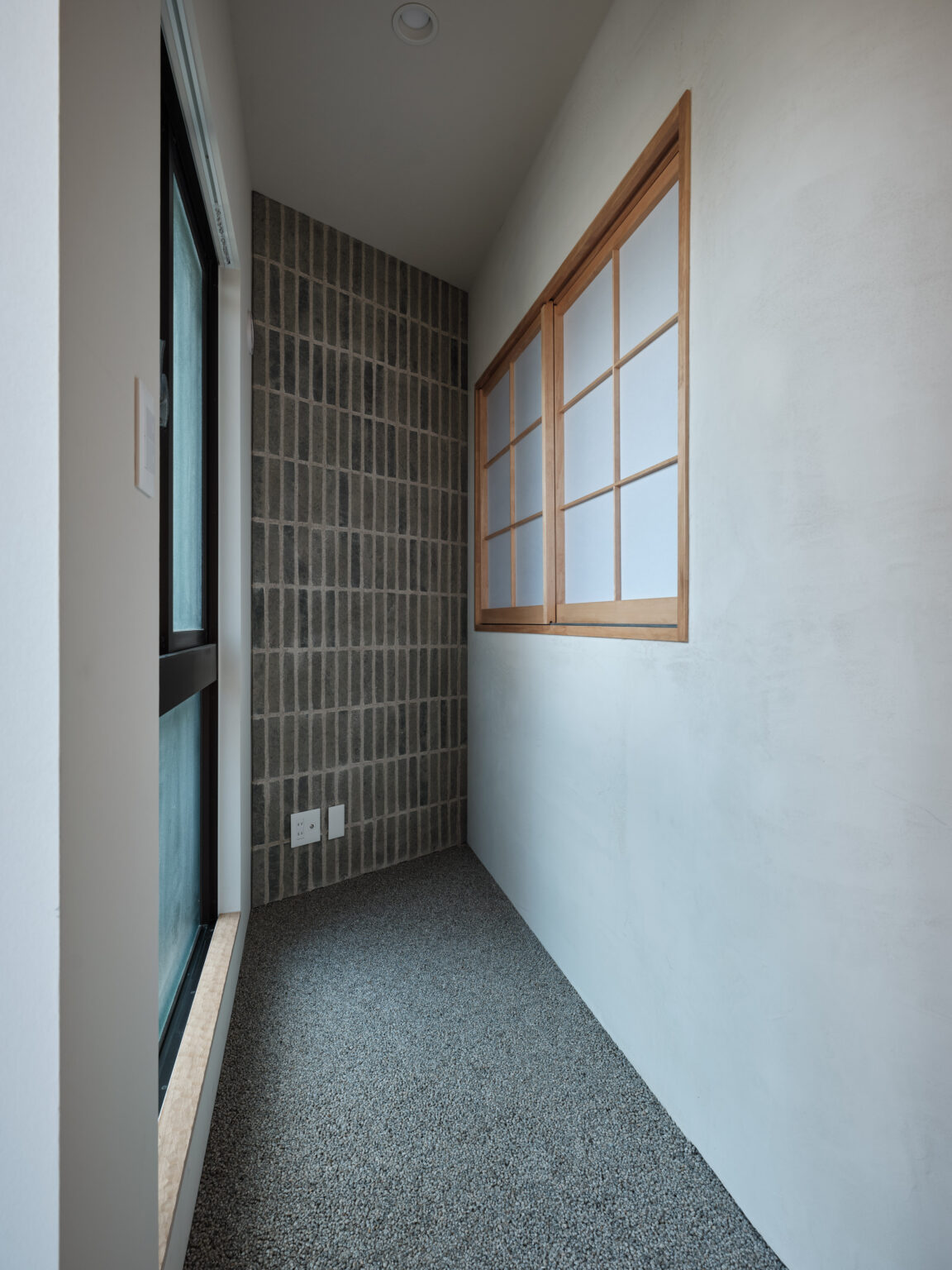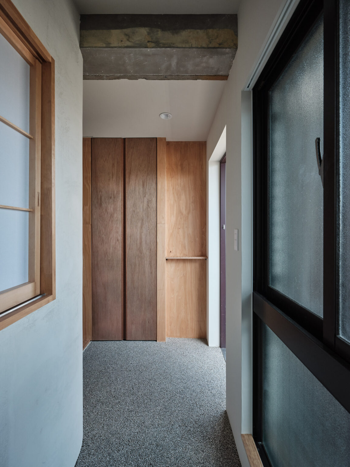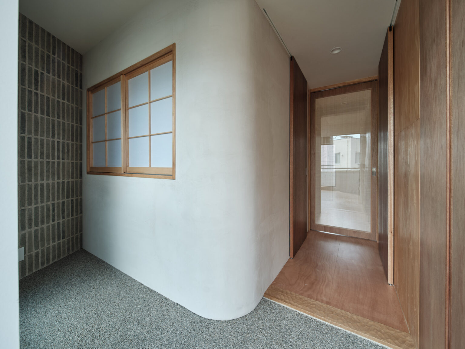 その先のには名栗加工を施し、木の陰影が空間の境界をやわらかく示す。小さな操作だが、家の入り口の構えを丁寧に整える。
