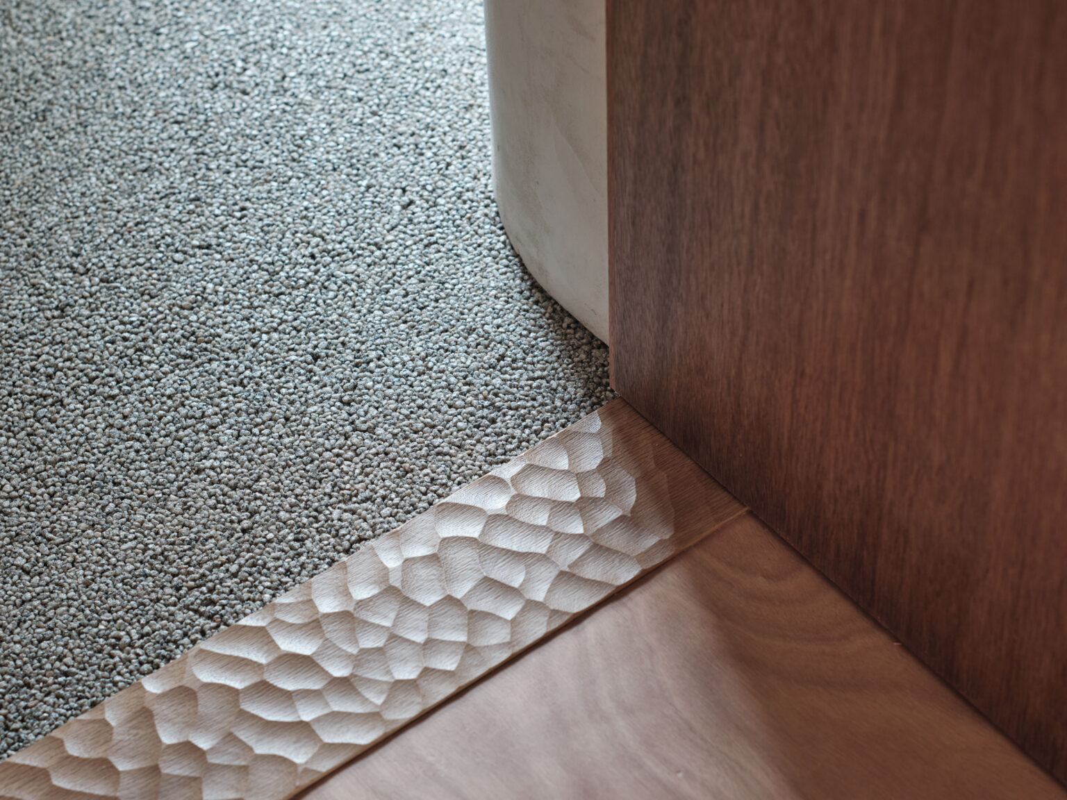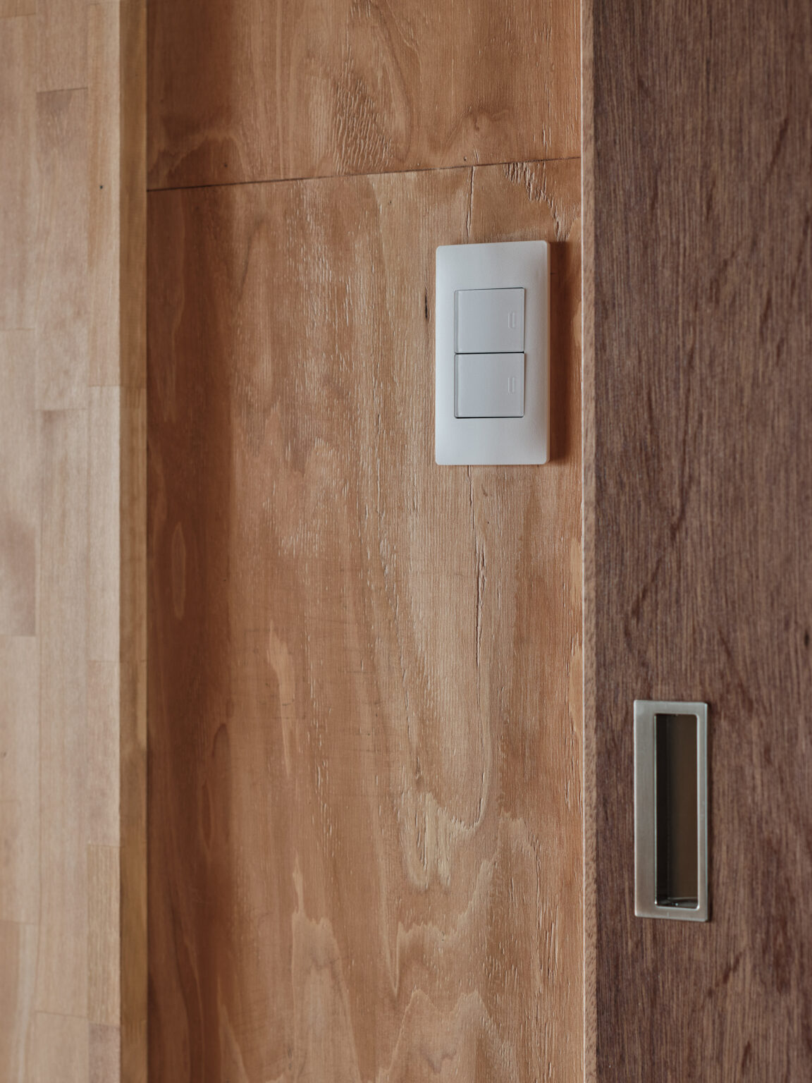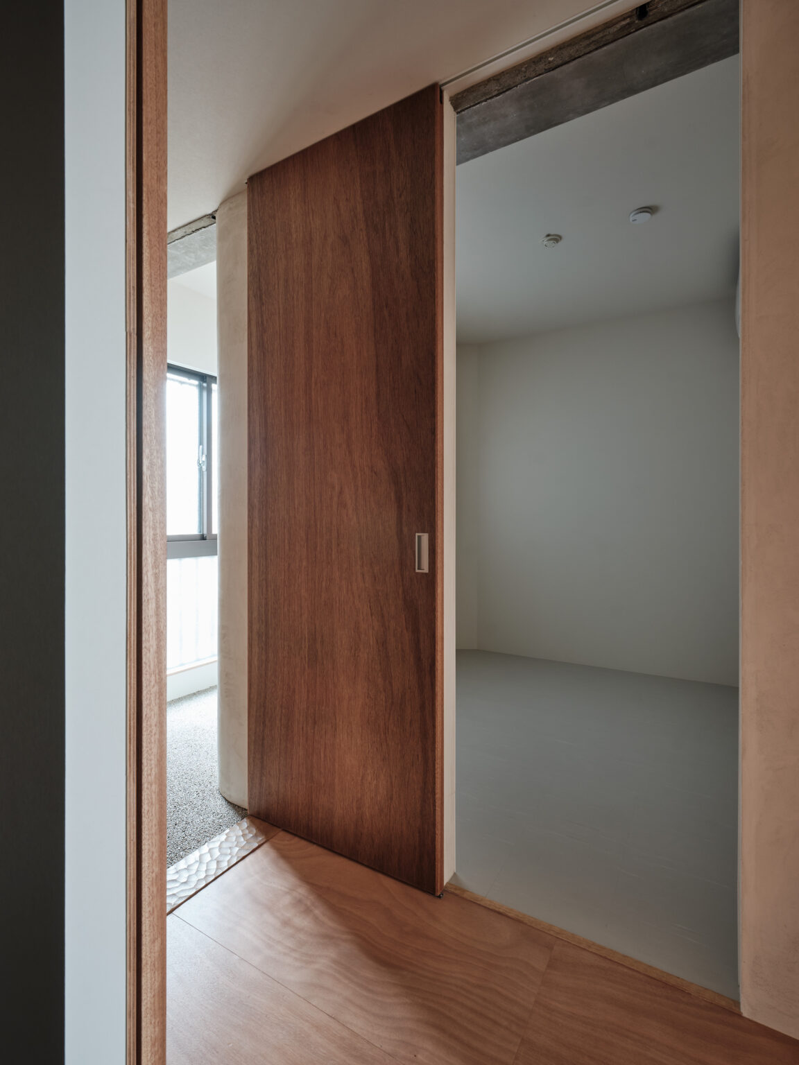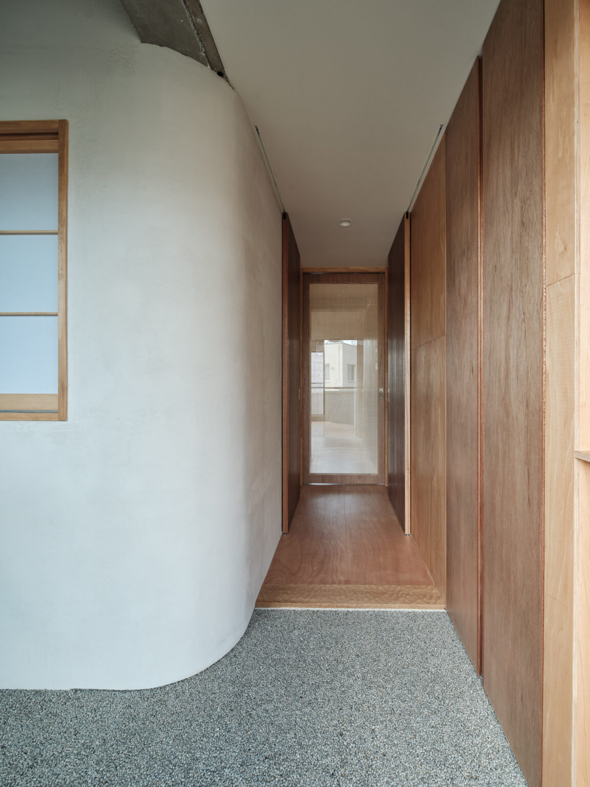 その先のには名栗加工を施し、木の陰影が空間の境界をやわらかく示す。小さな操作だが、家の入り口の構えを丁寧に整える。
