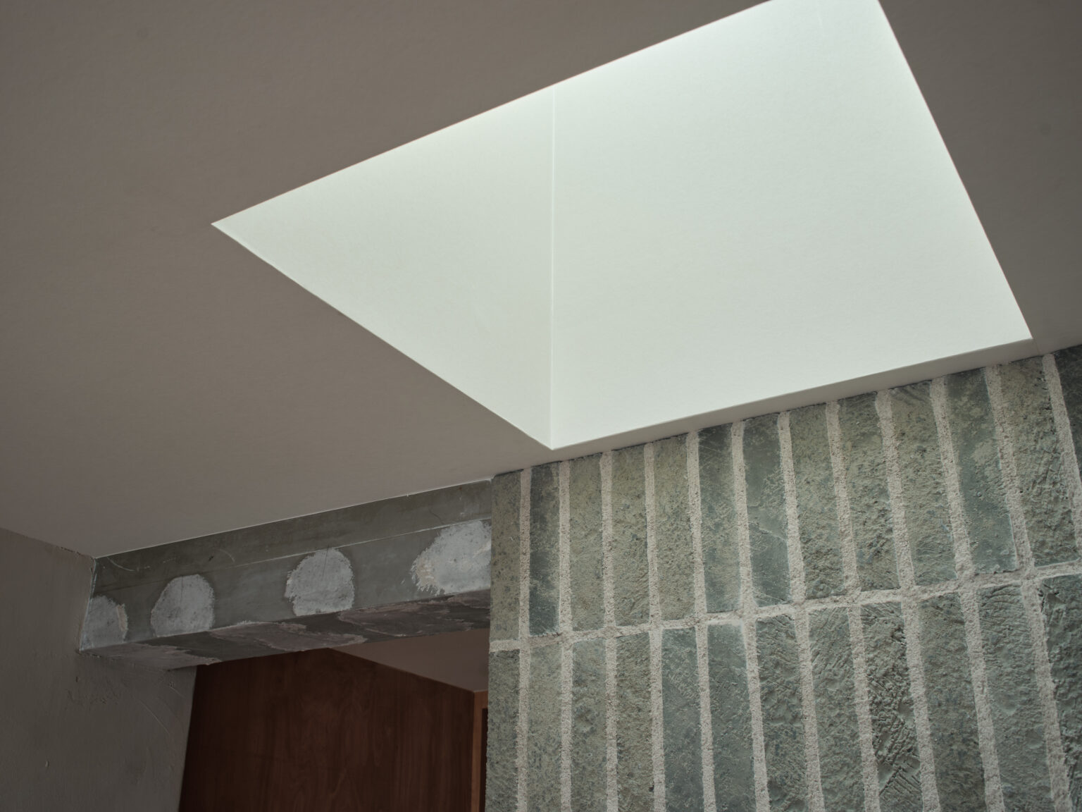 トップライトの光が部屋全体にのびやかに広がるようにした。光の落ちる場所には、ひとつずつ表情の異なるクラフトタイルを敷き込んだ。手仕事のざらつきに光が触れると、時間帯によって微妙に表情を変え、